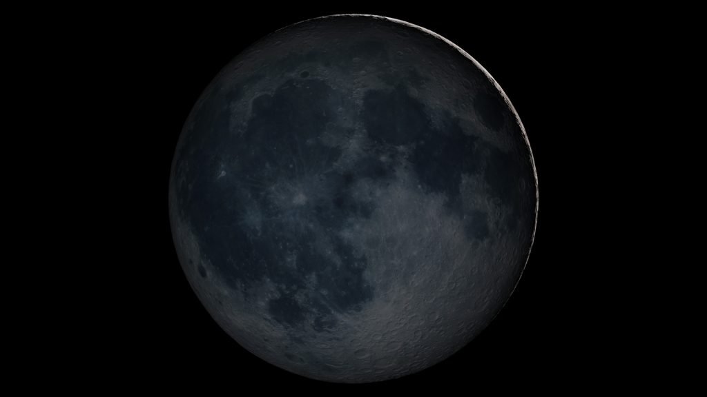 Hätte, wäre, könnte. Eine bekannte Tatsache ist, dass wir den Mond nur dann sehen können, wenn er aus irdischer Perspektive ganz oder teilweise im Licht ist, also entweder von der Sonne direkt oder indirekt beleuchtet wird – indirekt dann, wenn ihn das von der Erde reflektierte Sonnenlicht trifft, was gerade bei Neumond (aus lunarer Sicht bei Vollerde) in besonderem Maße der Fall ist. Allerdings verhindert das helle Streulicht der Erdatmosphäre, dass wir die Mondoberfläche im indirekten Sonnenlicht (auf dem Mond kann man dann im Erdschein spazierengehen) wahrnehmen können. Das atmosphärische Streulicht überstrahlt das doppelt reflektierte Sonnenlicht. Außerhalb der Erdatmosphäre, also etwa in einer Raumstation, ist das anders. Wenn man dort bei Neumond die blendend helle Sonne oberhalb des Mondes abdeckt, tritt der Mond als graue Scheibe auf schwarzem Grund deutlich hervor.